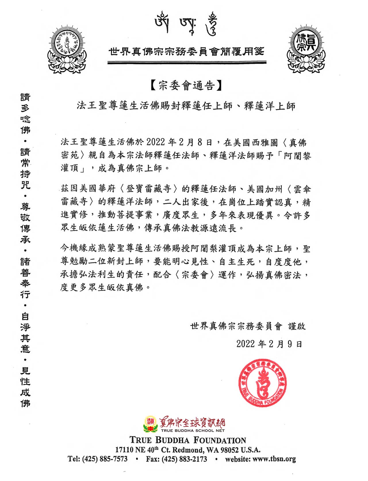 世界真佛宗宗務委員會 謹啟