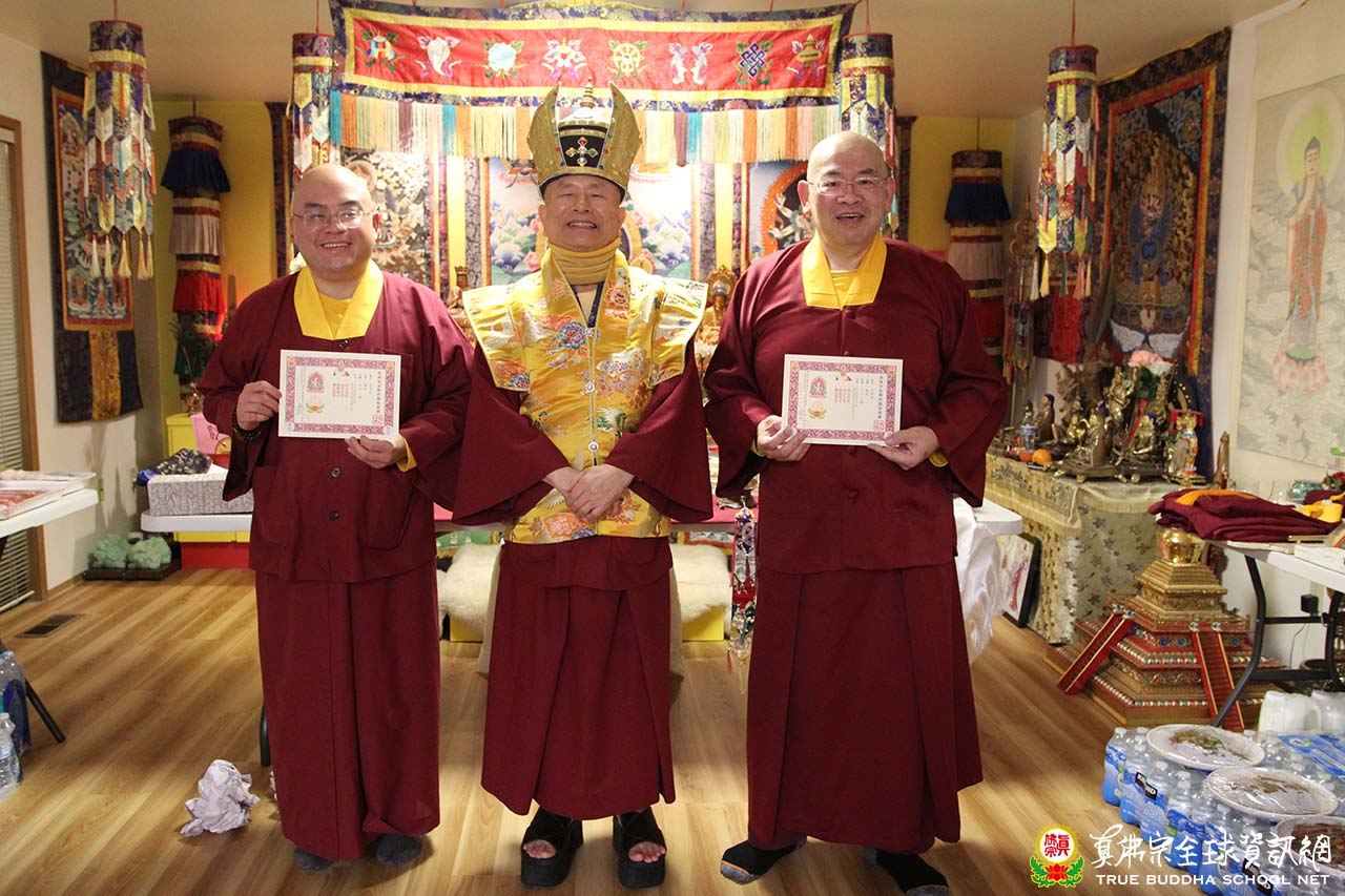 今機緣成熟蒙聖尊蓮生活佛賜授阿闍梨灌頂成為本宗上師,聖尊勉勵二位新封上師,要能明心見性、自主生死,自度度他,承擔弘法利生的責任,配合〈宗委會〉運作,弘揚真佛密法,度更多眾生皈依真佛。