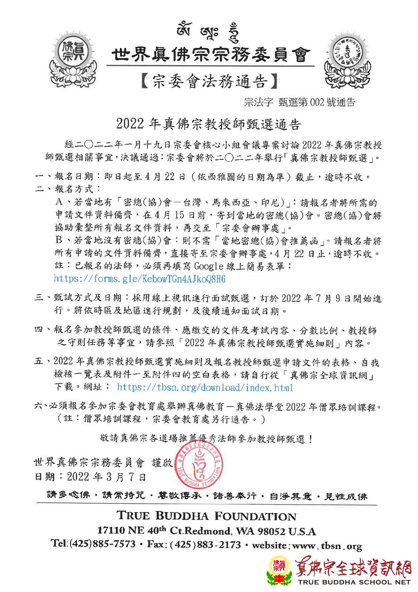 經二○二二年一月十九日宗委會核心小組會議專案討論2022年真佛宗教授師甄選相關事宜,決議通過:宗委會將於二○二二年舉行「真佛宗教授師甄選」。