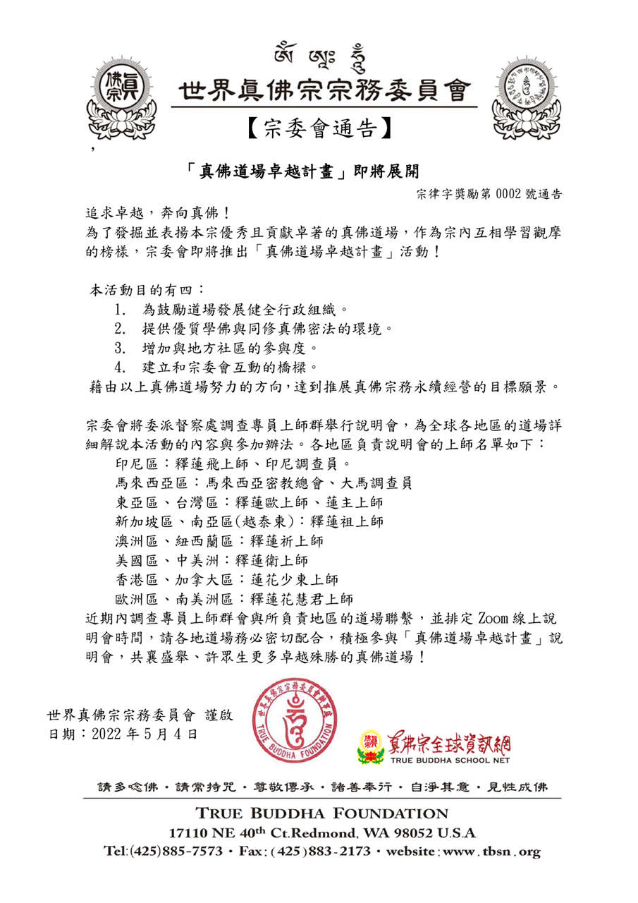 為了發掘並表揚本宗優秀且貢獻卓著的真佛道場,作為宗內互相學習觀摩的榜樣,宗委會即將推出「真佛道場卓越計畫」活動!
