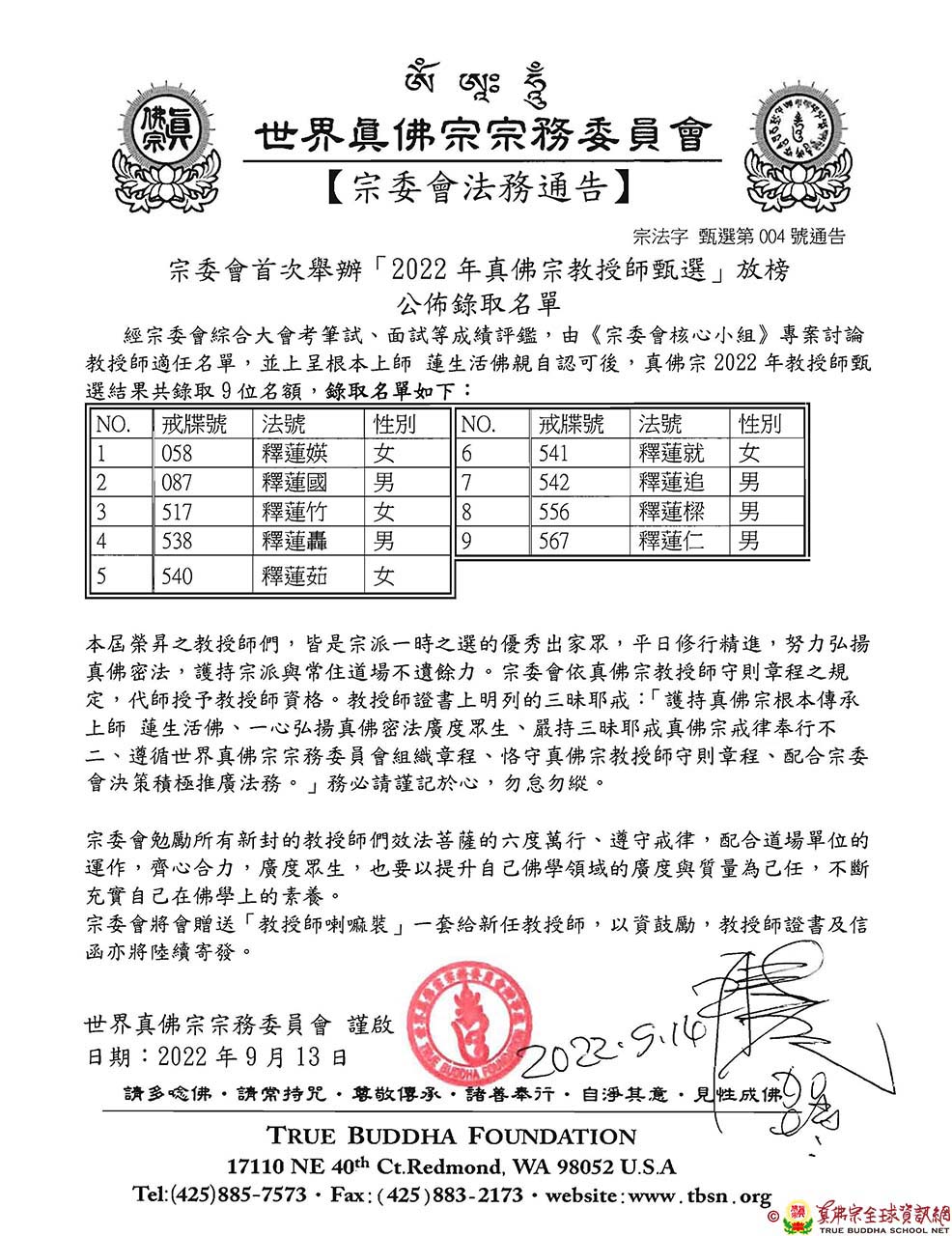 經宗委會綜合大會考筆試、面試等成績評鑑,由《宗委會核心小組》專案討論教授師適任名單,並上呈根本上師 蓮生活佛親自認可後,真佛宗2022年教授師甄選結果共錄取9位名額,錄取名單如下: