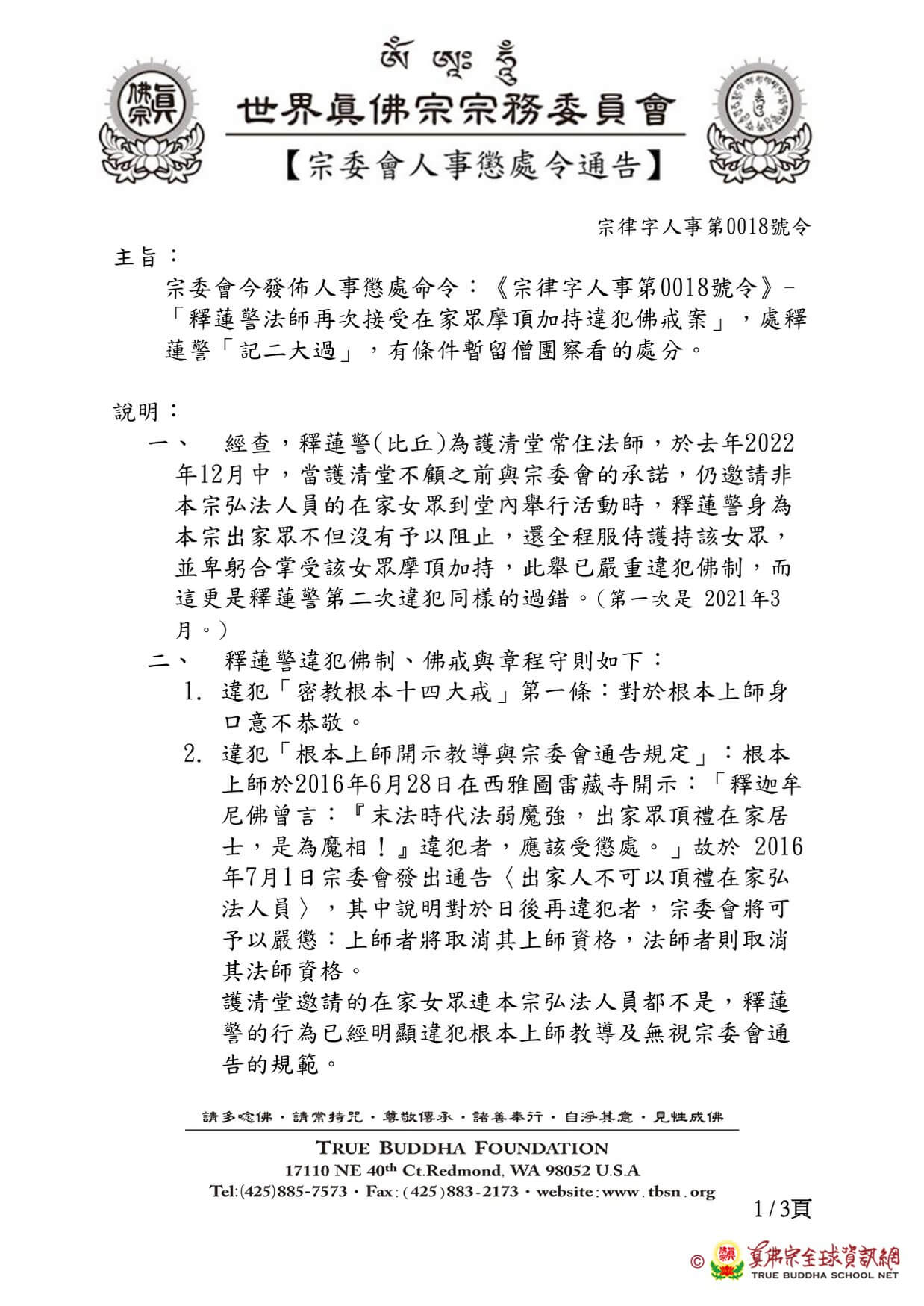 宗委會今發佈人事懲處命令:《宗律字人事第0018號令》-「釋蓮警法師再次接受在家眾摩頂加持違犯佛戒案」,處釋蓮警『記二大過』,有條件暫留僧團察看的處分。