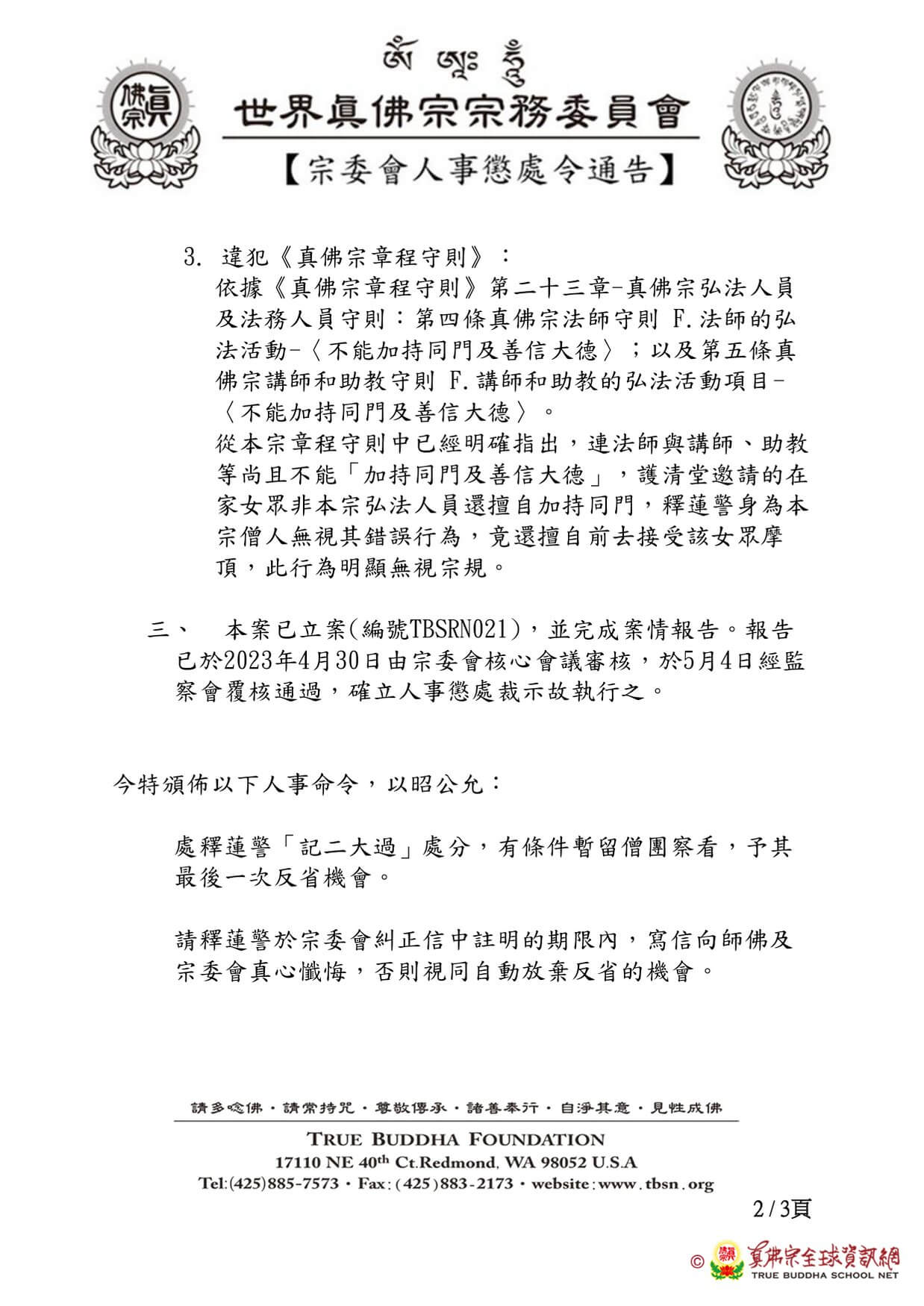 三、本案已立案(編號TBSRN021),並完成案情報告。報告已於2023年4月30日由宗委會核心會議審核,於5月4日經監察會覆核通過,確立人事懲處裁示故執行之。