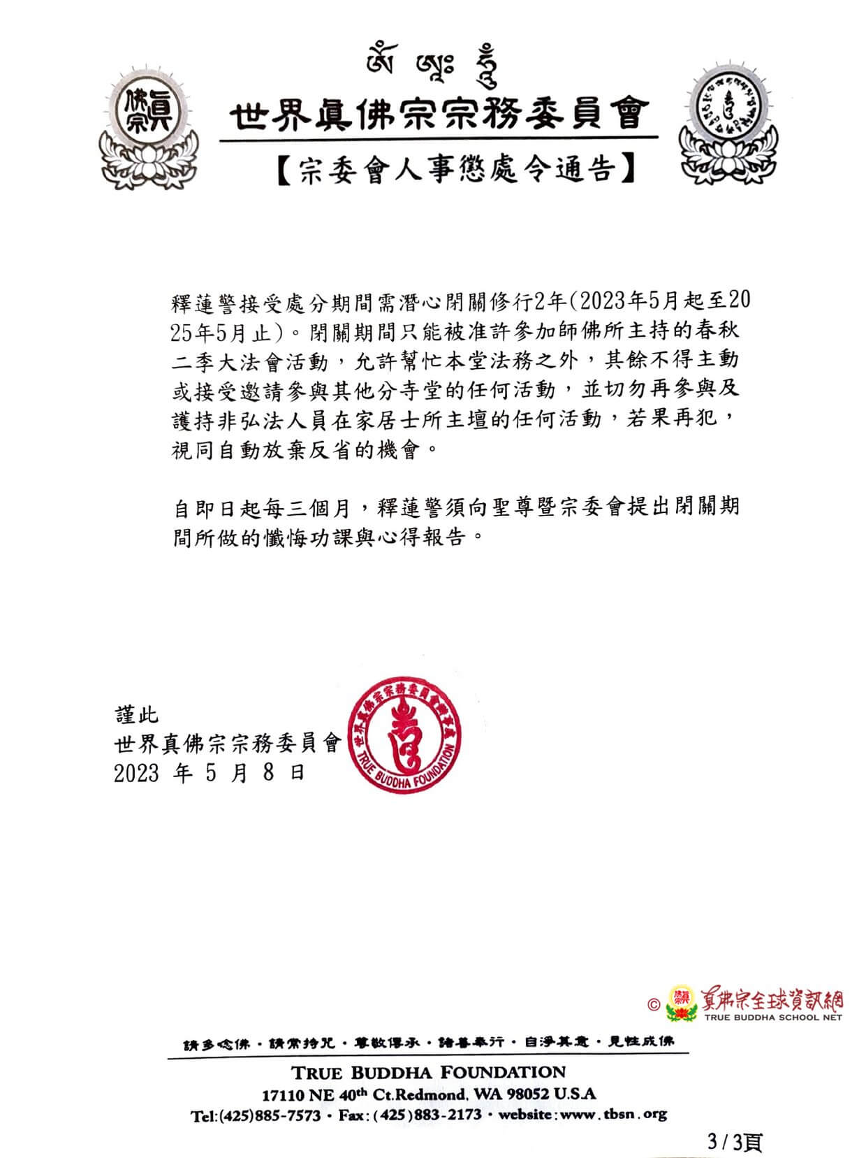 請釋蓮警於宗委會糾正信中註明的期限內,寫信向師佛及宗委會真心懺悔,否則視同自動放棄反省的機會。