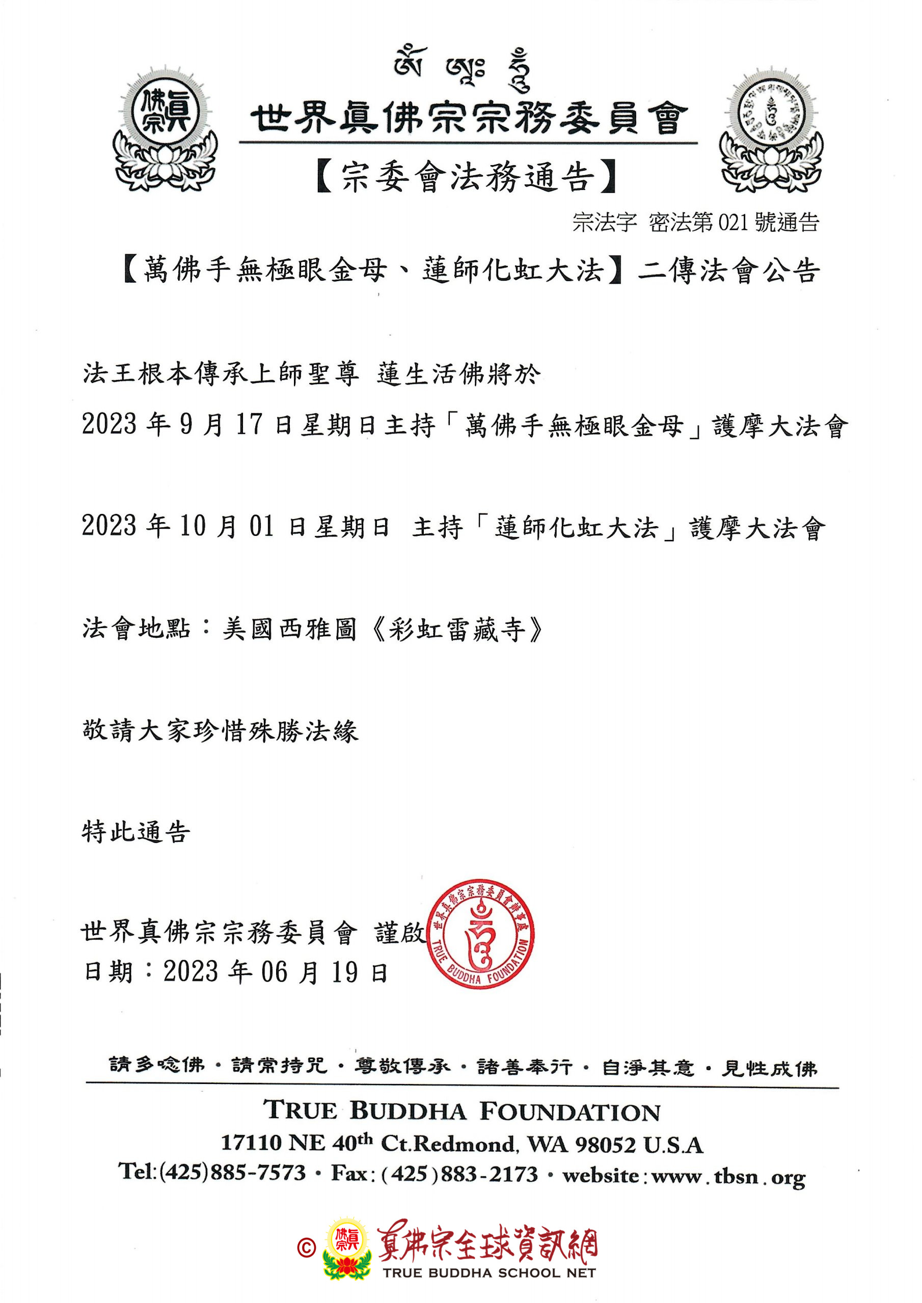 【宗委會法務通告】 宗法字 密法第021號通告 【萬佛手無極眼金母、蓮師化虹大法】二傳法會公告 法王根本傳承上師聖尊 蓮生活佛將於 2023年9月17日星期日 主持「萬佛手無極眼金母」護摩大法會 2023年10月01日星期日 主持「蓮師化虹大法」 護摩大法會 地點:美國西雅圖《彩虹雷藏寺》 敬請大家珍惜殊勝法緣。 特此通告 世界真佛宗宗務委員會 謹啟 日期:2023年06月19日