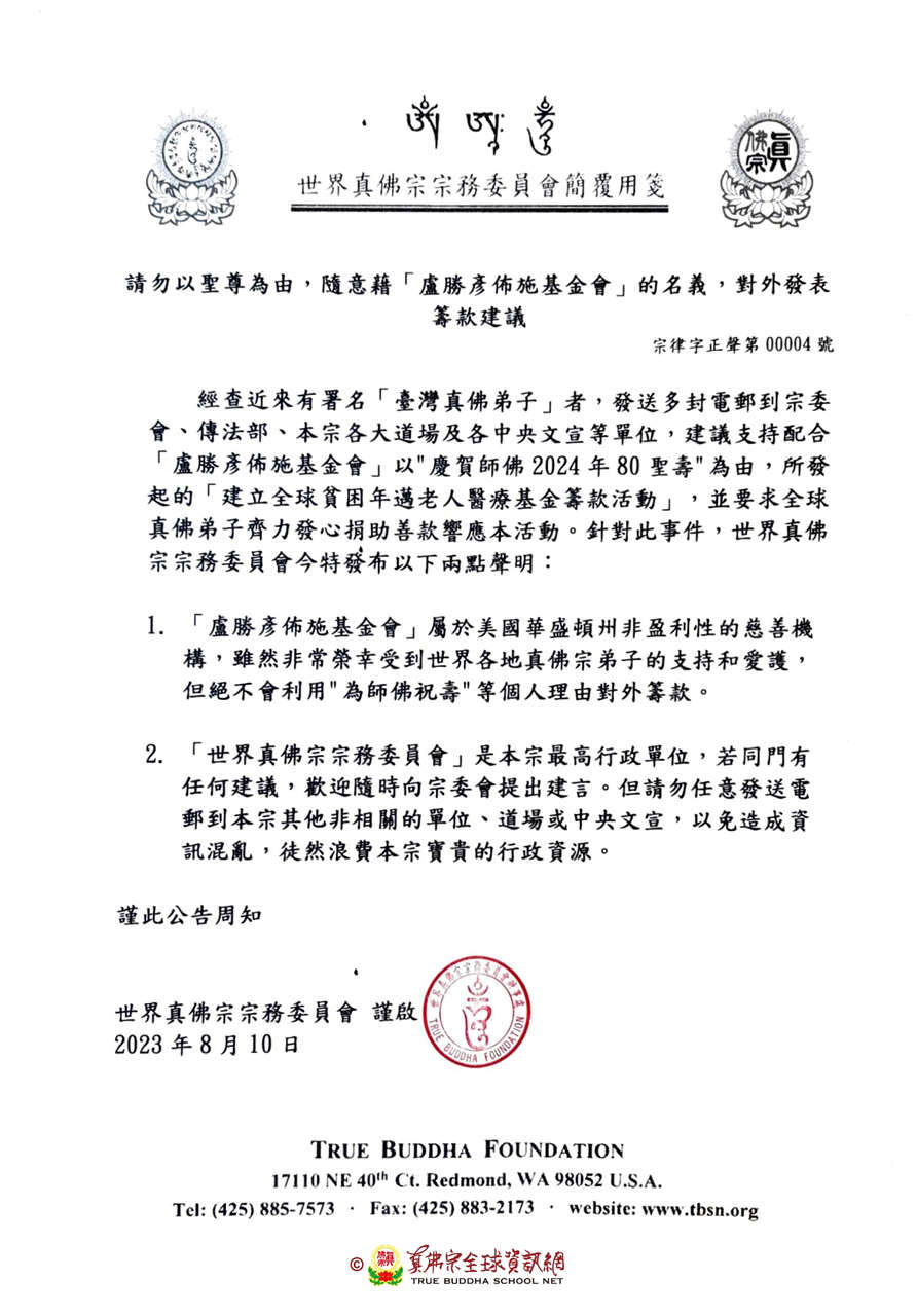 經查近來有署名「臺灣真佛弟子」者,發送多封電郵到宗委會、傳法部、本宗各大道場及各中央文宣等單位,建議支持配合「盧勝彥佈施基金會」以"慶賀師佛2024年80聖壽"為由,所發起的「建立全球貧困年邁老人醫療基金籌款活動」,並要求全球真佛弟子齊力發心捐助善款響應本活動。針對此事件,世界真佛宗宗務委員會今特發布以下兩點聲明: