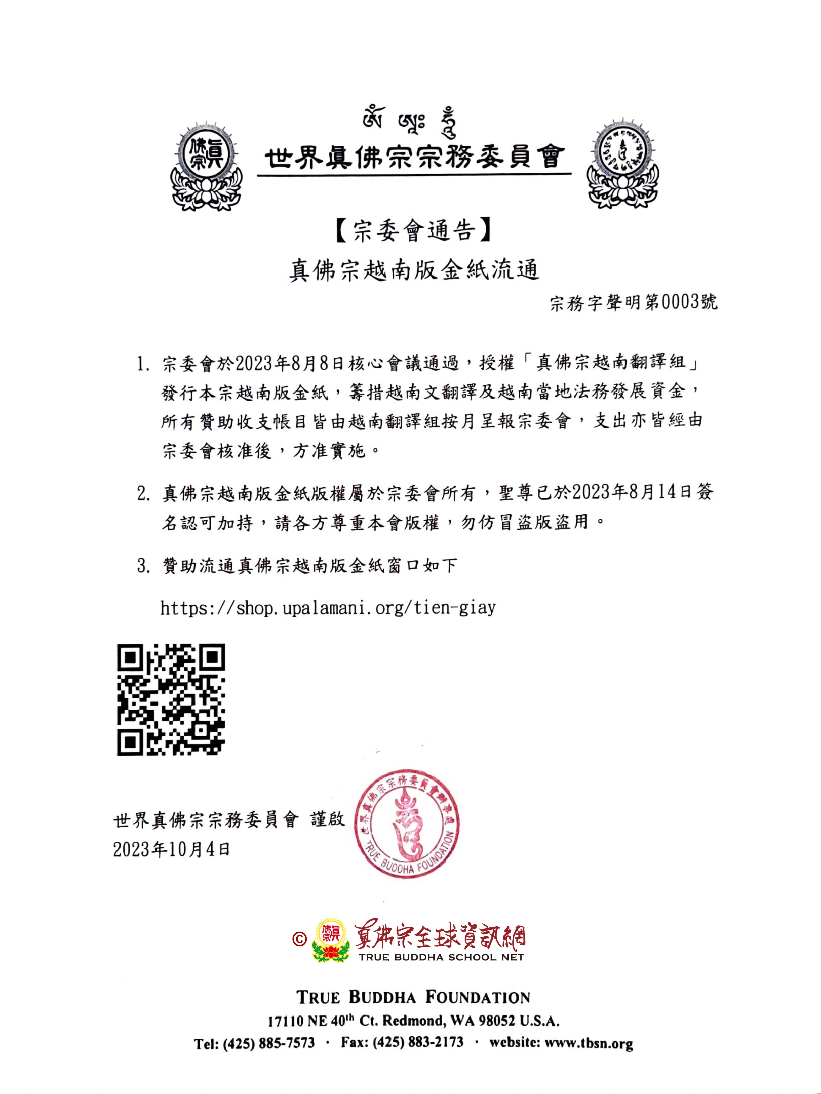 宗委會於2023年8月8日核心會議通過,授權「真佛宗越南翻譯組」發行本宗越南版金紙,籌措越南文翻譯及越南當地法務發展資金,所有贊助收支帳目皆由越南翻譯組按月呈報宗委會,支出亦皆經由宗委會核准後,方准實施。
