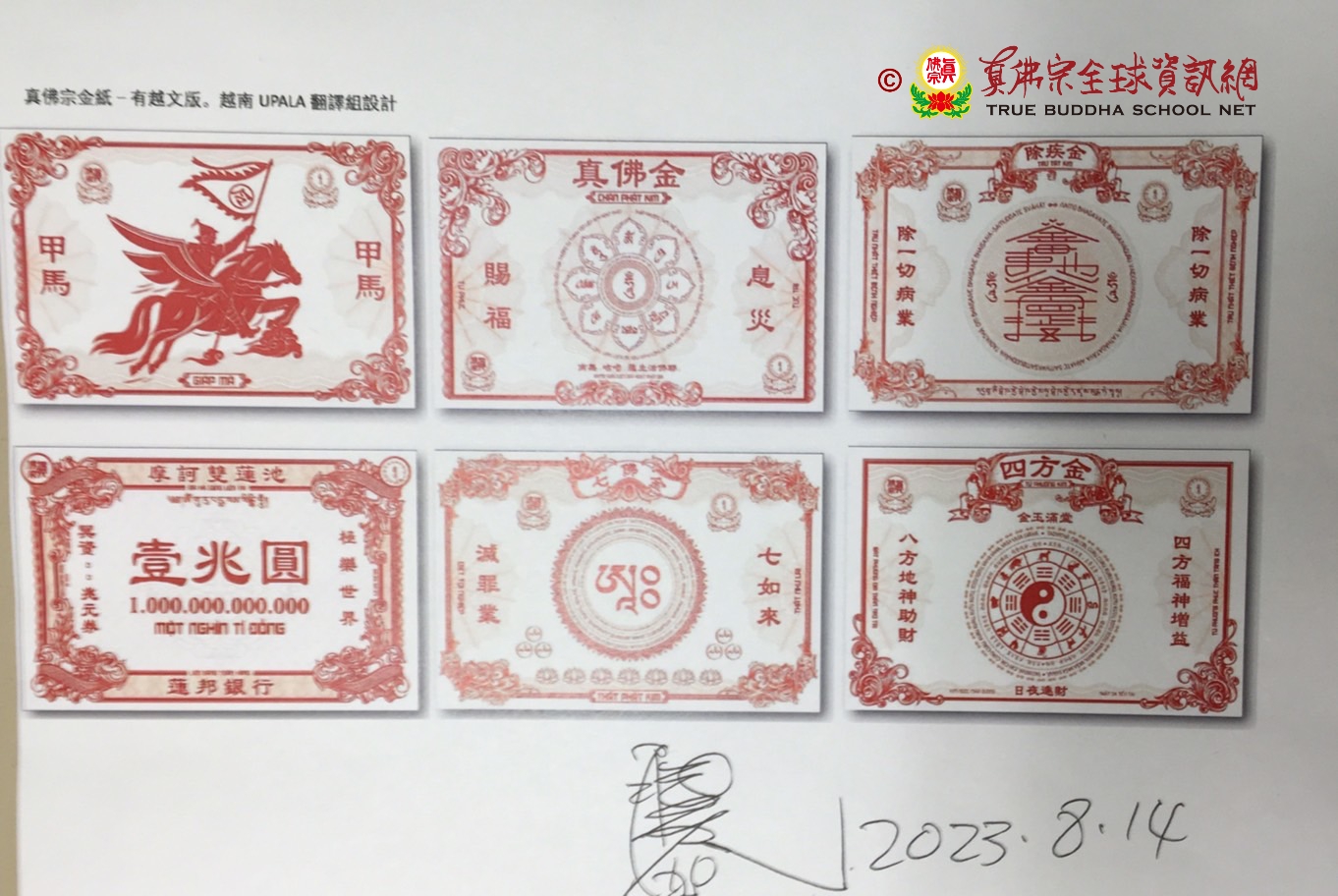 真佛宗越南版金紙版權屬於宗委會所有,聖尊已於2023年8月14日簽名認可加持,請各方尊重本會版權,勿仿冒盜版盜用。