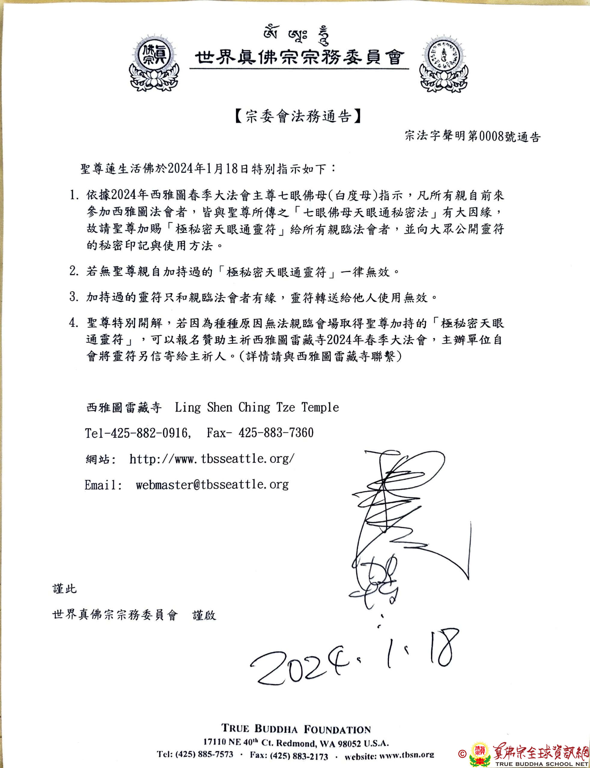 4.聖尊特別開解,若因為種種原因無法親臨會場取得聖尊加持的「極秘密天眼通靈符」,可以報名贊助主祈西雅圖雷藏寺2024年春季大法會,主辦單位自會將靈符另信寄給主祈人。(詳情請與西雅圖雷藏寺聯繫)