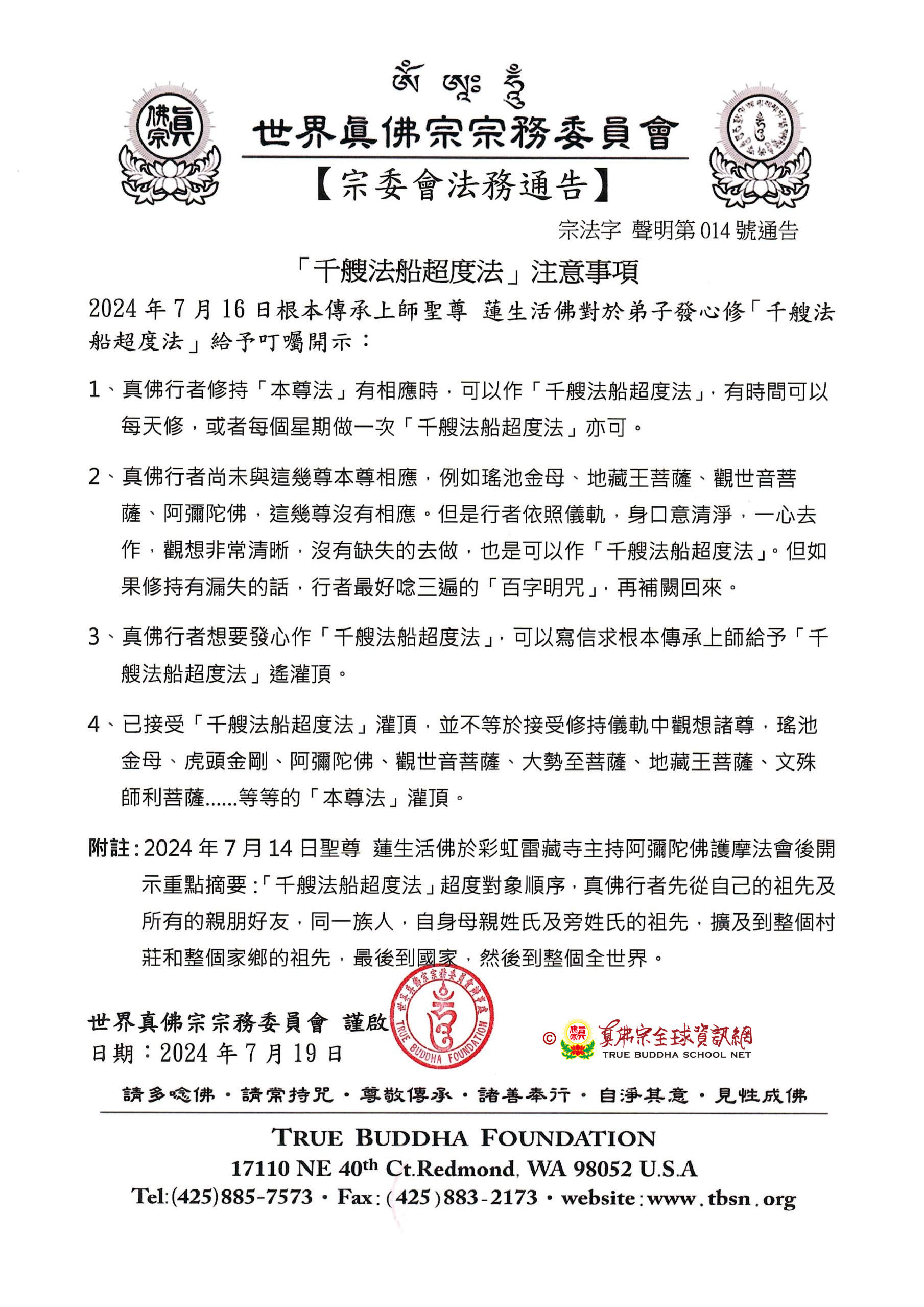 2024年7月16日根本傳承上師聖尊 蓮生活佛對於弟子發心修「千艘法船超度法」給予叮囑開示: