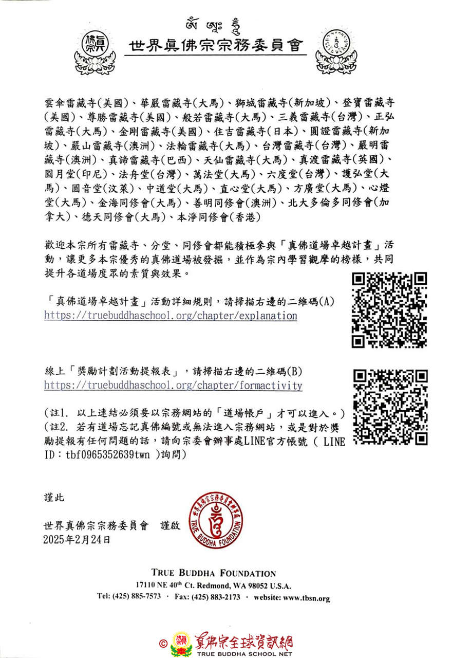 歡迎本宗所有雷藏寺、分堂、同修會都能積極參與「真佛道場卓越計畫」活動,讓更多本宗優秀的真佛道場被發掘,並作為宗內學習觀摩的榜樣,共同提升各道場度眾的素質與效果。